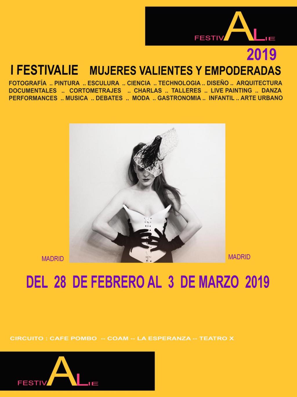 FestivAlie (Festival de Mujeres Artistas Intelectuales y Empoderadas) se celebrará del 28 de febrero al 03 de marzo en varios espacios céntricos de Madrid. Contará con 65 artistas invitadas (fotógrafas, poetas, actrices, cantantes, DJs…), y se realizarán además varias actividades: coloquios, exposiciones, teatro, conciertos, charlas, debates, talleres… e incluso una exposición creada especialmente por FestivAlie: «Mujeres olvidadas», donde hablaremos de mujeres que han formado parte de la historia.