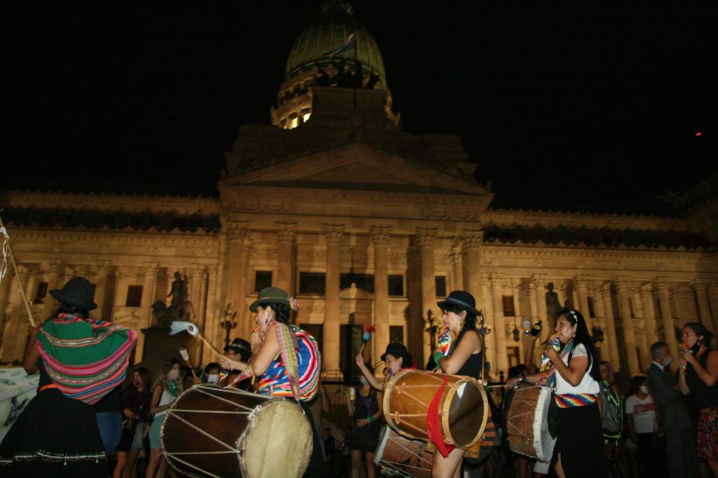 Ya cerca de las 9 cuando gran parte de la movilización desconcentraba, y como les sikuris siempre se quedan hasta el final, las mujeres originarias comenzaron a tocar nuevamente, y emprendieron su marcha hacia el frente del Congreso, se renovaron espectadoras y aplausos, las nuevas generaciones, la niñez indígena pasó nuevamente al centro a recrear los bailes colectivos. Y se dio cuenta así de que ya hay más de tres generaciones sosteniendo la visibilidad y las voces de las mujeres y disidencias indígenas en Buenos Aires. La música acerca diferencias, saca sonrisas, hace avanzar las luchas.