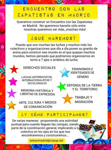 Así, ahora que las compañeras zapatistas vienen a vernos a nosotras acá, a todas aquellas que no hemos podido ir para allá, queremos seguir sus palabras, de las que tanto hemos aprendido, movilizarnos y tejer redes. Estamos en marcha construyendo un encuentro, al estilo zapatista, para encontrarnos entre nosotras y con la delegación que viene a Europa. La propuesta parte de que creemos que es tan importante tanto la parte logística como la agenda política común para recibir a las compañeras zapatistas. Queremos compartir nuestras dificultades, aprendizajes, victorias, coyunturas y diferencias también. Saber quiénes somos, cómo y dónde estamos. Nos estamos organizando ya en torno a 7 ejes transversales y no excluyentes que integran nuestras diferentes luchas en Madrid: derechos sociales; luchas antirracistas; internacionalista y decoloniales; memoria histórica y libertad de expresión, transfeminismos, arte, cultura y medios de comunicación, defensa de la tierra y el territorio y, trabajo y migración.