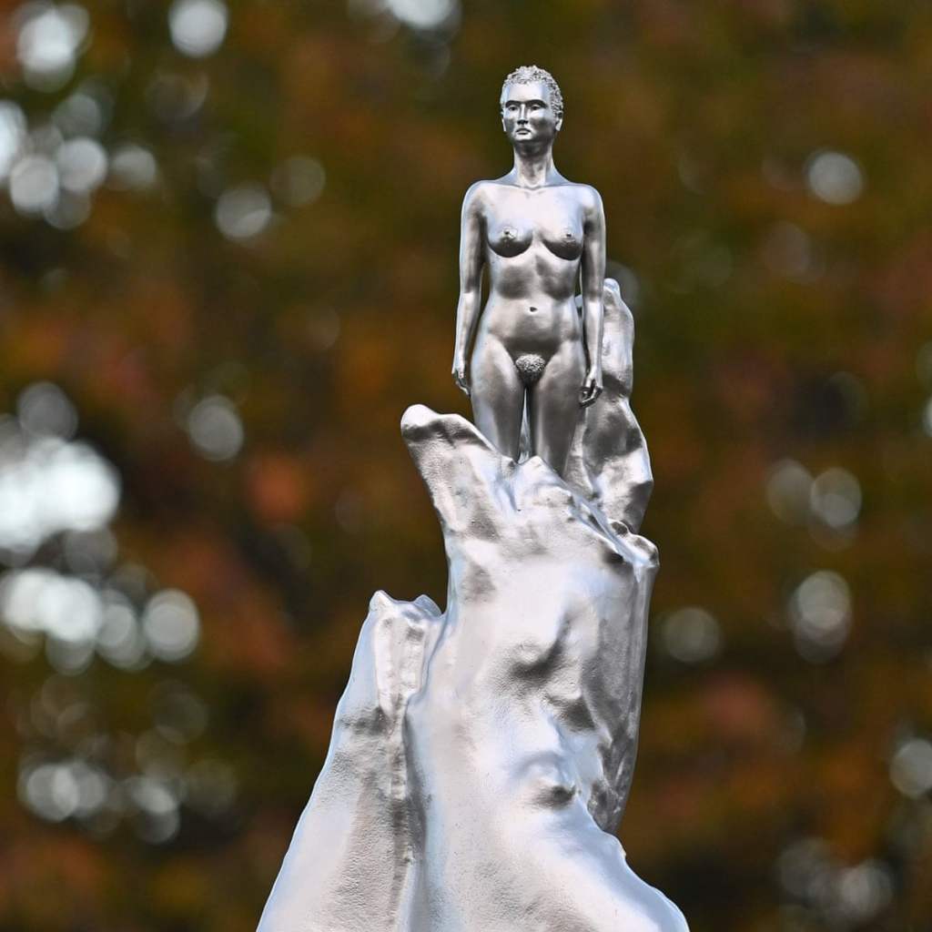 Escultura con un pedestal con referencias a Mary Wollstonecraft, también se puede ver gran parte de la esencia de Maggi Hambling. Del pedestal arranca una forma vertical plateada que juega con los límites de la abstracción. Encima de esta forma vemos una figurita humana que podría ser interpretada de muchas maneras. La interpretación que más me gusta es la de que podría ser una joven lesbiana musculosa anónima, o la misma Maggi Hambling de joven, con una actitud desafiante frente al mundo.