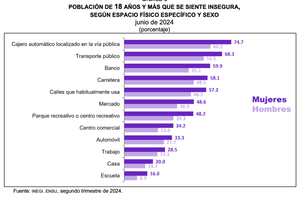 Respecto a los espacios físicos específicos en los que las personas se sienten inseguras, la ENSU 2024 señala que las mujeres también lideran las cifras en todas las categorías. Desde los cajeros automáticos localizados en la vía pública, el «Tránsporte público», hasta las «calles que habitualmente usa», el «Mercado» o el «Parque recreativo o centro recreativo»: el espacio público cotidiano se vive desde la inseguridad para la mayoría de las mujeres encuestadas. Según información compartida por la Secretaría de Desarrollo Agrario, Territorial y Urbano, en 2019, por ejemplo, la ONU señaló que «en la Ciudad de México el 96% de las mujeres fueron víctimas por lo menos una vez de algún acto de violencia en el transporte público, desde agresiones verbales, contacto físico forzado o persecución, en 9 de cada 10 casos quien agrede son hombres.»